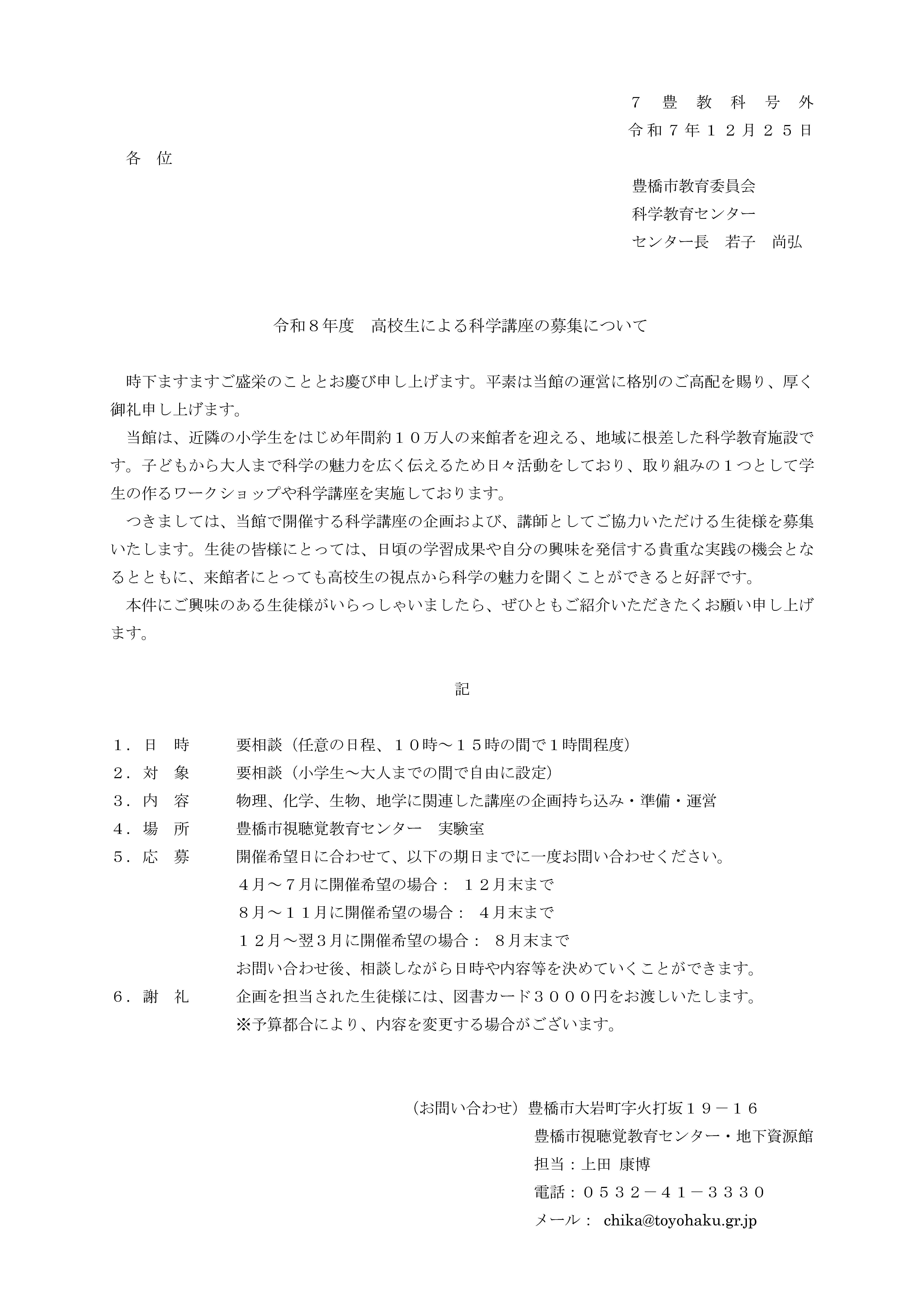 令和8年度 高校生による科学講座の募集について 豊橋市視聴覚教育センターでは、市民に向けた科学講座の企画・実施にご協力いただける高校生を募集しております。 科学に親しむだけでなく、科学の楽しさを伝えてみたい!という高校生や、教員のみなさまはぜひ一度お問い合わせ下さい。 上記依頼文のPDFはこちらから 【参考】R6年度までの高校生による科学講座実績